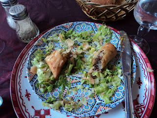 The lunch itself was absolutely delicious! The meal began with an array of small bowls each containing a different variety of Moroccan salad: Fresh cucumbers with tomatoes, fresh tomatoes with onion, cooked carrots served cold with parsley, cooked beets served cold with garlic and parsley, cold white rice with cilantro and pepper, cooked potatoes cut into cubes with cilantro and parsley, grilled eggplant with roasted garlic and tomatoes served warm, grilled green bell peppers with grilled tomatoes served warm. Using bread as a scoop, we dipped into the bowls and got a wonderful tasting of Moroccan cooking. Next, I had a serving of braewats. A braewat is much like an egg roll, although it can be a roll, a square, a triangle, or a disk. The fillings can vary. The ones I had for lunch were savory: Spiced ground beef with rice noodles, spiced chicken with rice noodles, white cheese with herbs, and one that tasted just like pastilla with savory chicken, onions, raisins and almonds sprinkled with powdered sugar and cinnamon. Here is a picture of my almost empty plate: